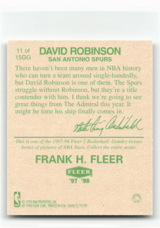This is a nice example of a 1997-98 Fleer #11GG David Robinson Goudey Greats Other important information about this card:In 1997 David Robinson played for the San Antonio Spurs.Please check...