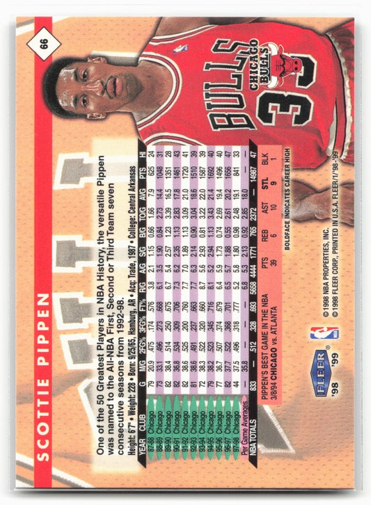 This is a nice example of a 1998-99 Fleer Tradition #66 Scottie Pippen Other important information about this card:In 1998 Scottie Pippen played for the Chicago Bulls.Please check out our...