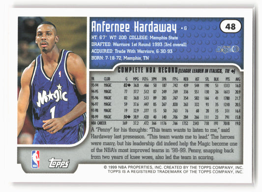 This is a nice example of a 1999-00 Topps #48 Anfernee Hardaway Other important information about this card:In 1999 Anfernee Hardaway played for the Orlando Magic.Please check out our other...