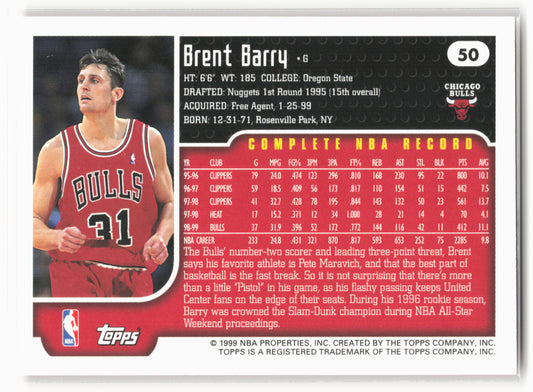 This is a nice example of a 1999-00 Topps #50 Brent Barry Other important information about this card:In 1999 Brent Barry played for the Chicago Bulls.Please check out our other...