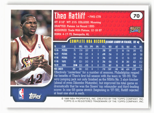 This is a nice example of a 1999-00 Topps Tipoff #70 Theo Ratliff Other important information about this card:In 1999 Theo Ratliff played for the Philadelphia 76ers.Please check out our...