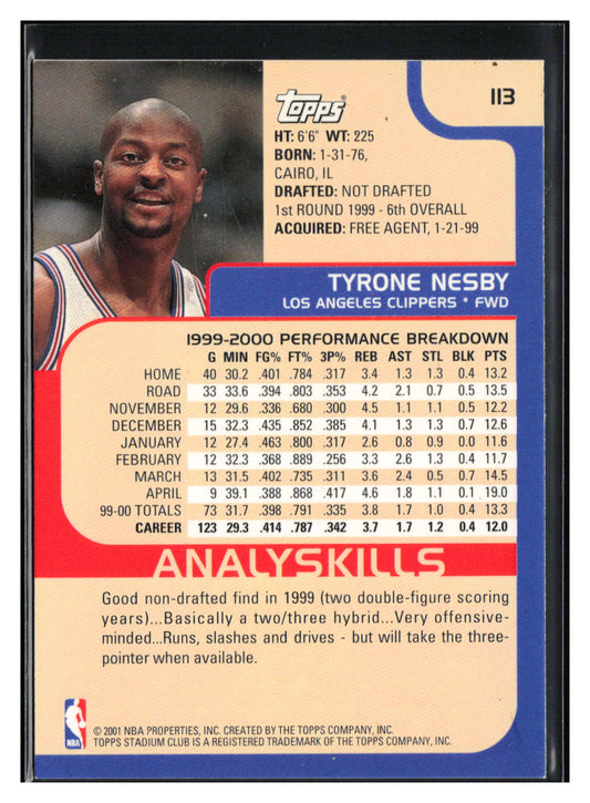 This is a nice example of a 2000-01 Stadium Club #113 Tyrone Nesby Other important information about this card:In 2000 Tyrone Nesby played for the Los Angeles Clippers.Please check out...