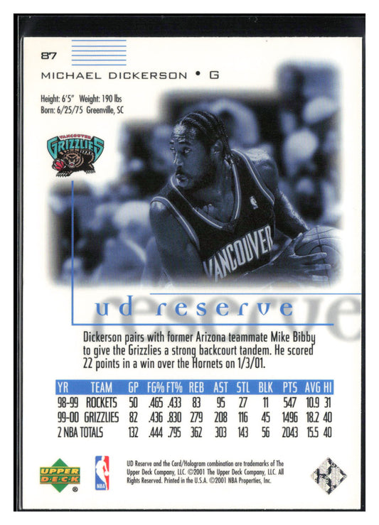 This is a nice example of a 2000-01 UD Reserve #87 Michael Dickerson Other important information about this card:In 2000 Michael Dickerson played for the Vancouver Grizzlies.Please check out our...