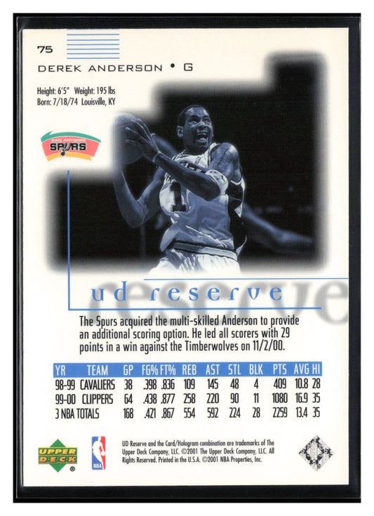 This is a nice example of a 2000-01 UD Reserve #75 Derek Anderson Other important information about this card:In 2000 Derek Anderson played for the San Antonio Spurs.Please check out...