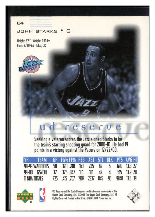This is a nice example of a 2000-01 UD Reserve #84 John Starks Other important information about this card:In 2000 John Starks played for the Utah Jazz.Please check out our...