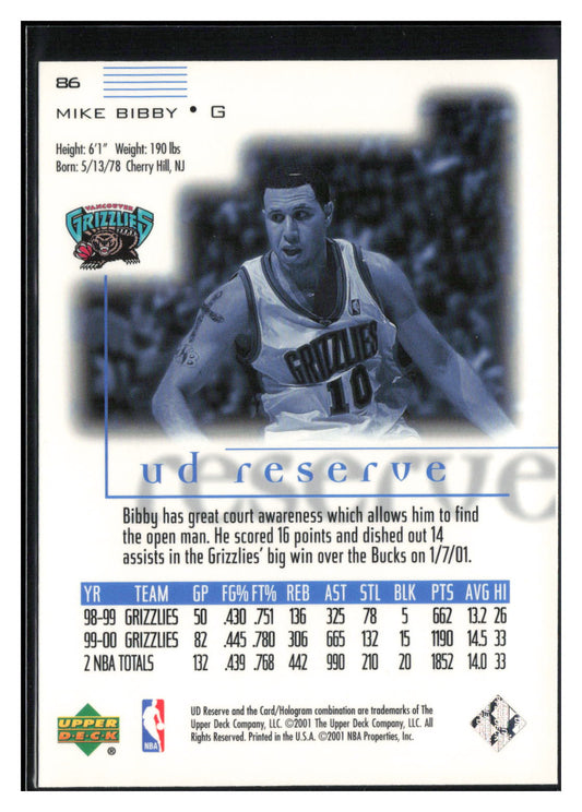 This is a nice example of a 2000-01 UD Reserve #86 Mike Bibby Other important information about this card:In 2000 Mike Bibby played for the Vancouver Grizzlies.Please check out our...