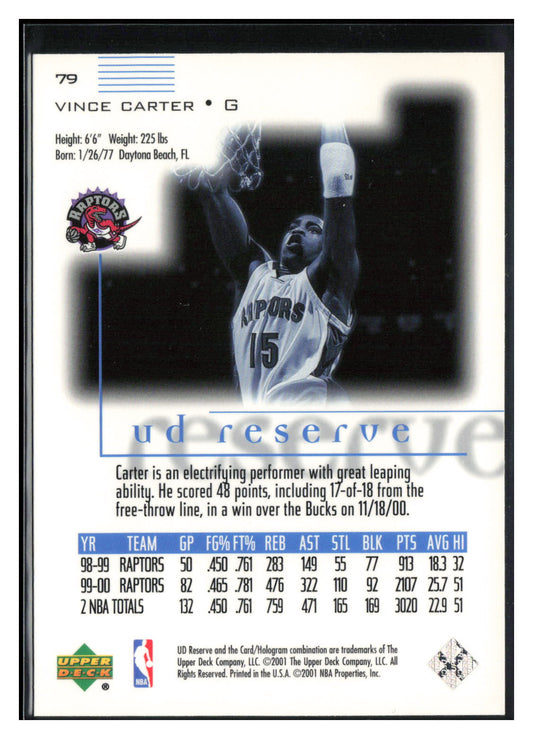 This is a nice example of a 2000-01 UD Reserve #79 Vince Carter Other important information about this card:In 2000 Vince Carter played for the Toronto Raptors.Please check out our...