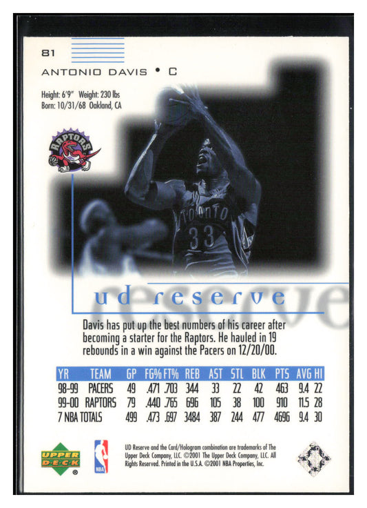 This is a nice example of a 2000-01 UD Reserve #81 Antonio Davis Other important information about this card:In 2000 Antonio Davis played for the Toronto Raptors.Please check out our...