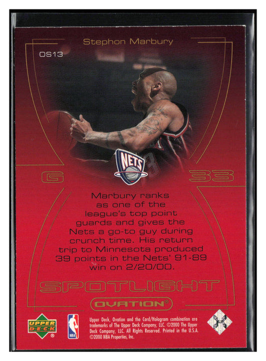 This is a nice example of a 2000-01 Upper Deck Ovation #OS13 Stephon Marbury Spotlight Other important information about this card:In 2000 Stephon Marbury played for the New Jersey Nets.Please...