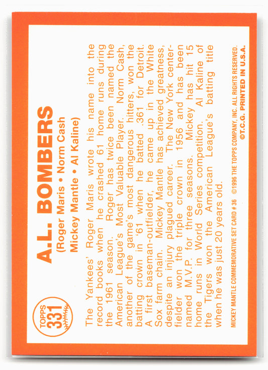 This is a nice example of a 1997 Topps #36 A.L. Bombers Mickey Mantle Commemorative Reprints Other important information about this card:In 1997 A.L. Bombers played for the MLB.Please check...