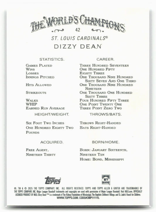 This is a nice example of a 2025 Topps Allen & Ginter #42 Dizzy Dean Other important information about this card:In 2025 Dizzy Dean played for the St. Louis Cardinals.Please...