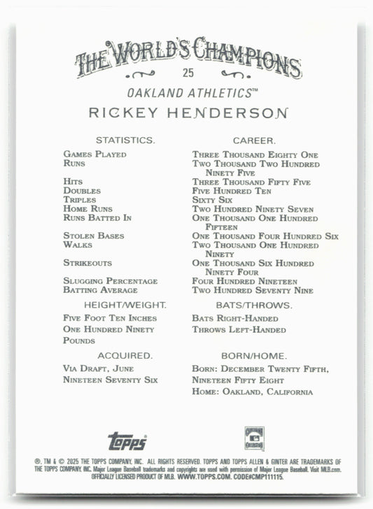 This is a nice example of a 2025 Topps Allen & Ginter #25 Rickey Henderson Other important information about this card:In 2025 Rickey Henderson played for the Oakland Athletics.Please check...