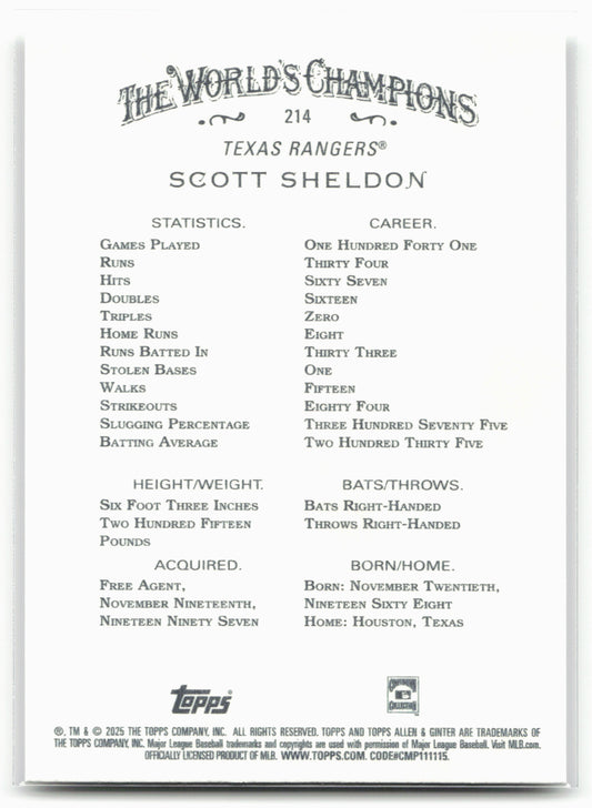 This is a nice example of a 2025 Topps Allen & Ginter #214 Scott Sheldon Other important information about this card:In 2025 Scott Sheldon played for the Texas Rangers.Please check...