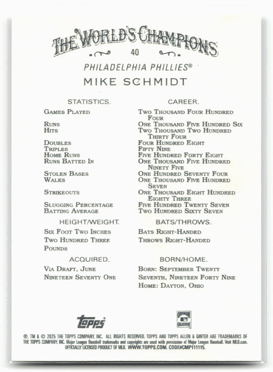 This is a nice example of a 2025 Topps Allen & Ginter #40 Mike Schmidt Other important information about this card:In 2025 Mike Schmidt played for the Philadelphia Phillies.Please check...