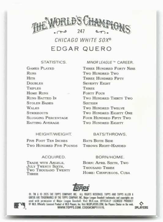 This is a nice example of a 2025 Topps Allen & Ginter #247 Edgar Quero Other important information about this card:RCIn 2025 Edgar Quero played for the Chicago White Sox.Please...