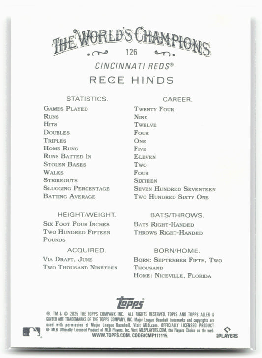 This is a nice example of a 2025 Topps Allen & Ginter #126 Rece Hinds Other important information about this card:RCIn 2025 Rece Hinds played for the Cincinnati Reds.Please check...