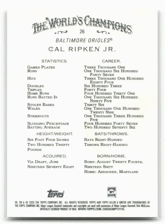 This is a nice example of a 2025 Topps Allen & Ginter #26 Cal Ripken Jr. Other important information about this card:In 2025 Cal Ripken Jr. played for the Baltimore...