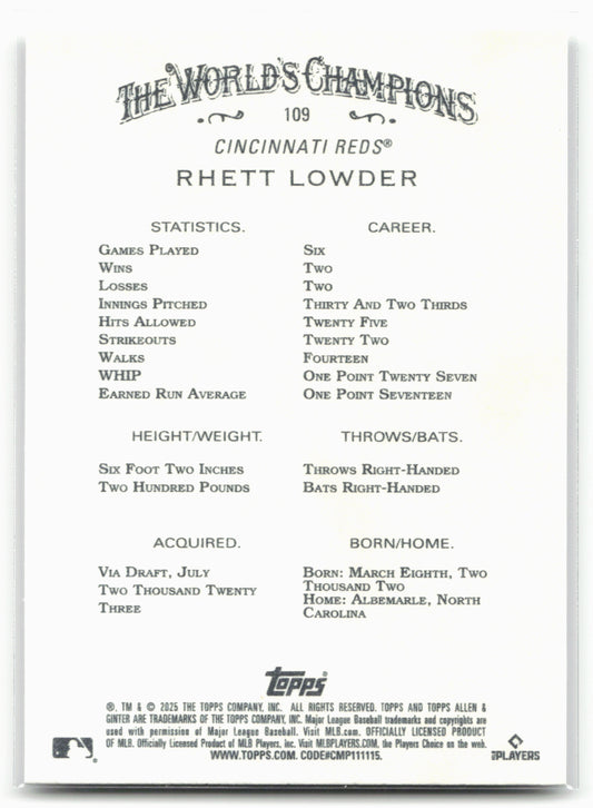 This is a nice example of a 2025 Topps Allen & Ginter #109 Rhett Lowder Other important information about this card:RCIn 2025 Rhett Lowder played for the Cincinnati Reds.Please check...