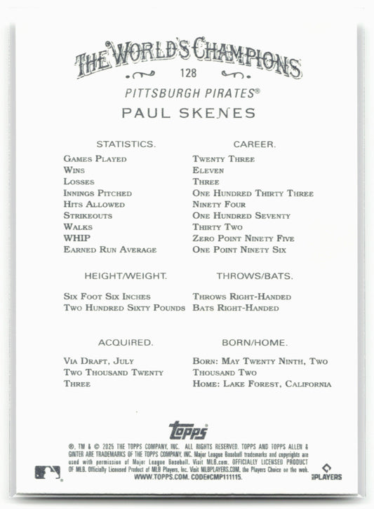 This is a nice example of a 2025 Topps Allen & Ginter #128 Paul Skenes Other important information about this card:In 2025 Paul Skenes played for the Pittsburgh Pirates.Please check...