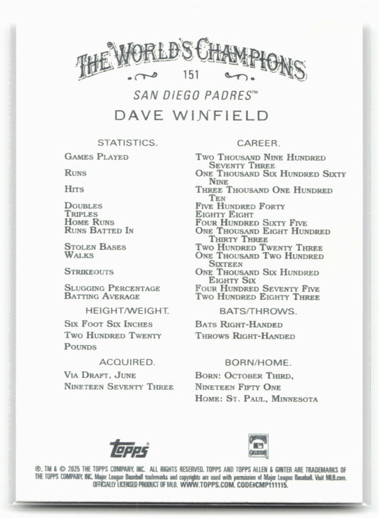 This is a nice example of a 2025 Topps Allen & Ginter #151 Dave Winfield Other important information about this card:In 2025 Dave Winfield played for the San Diego Padres.Please...