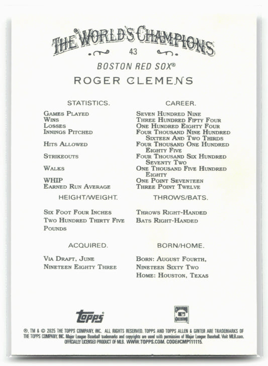 This is a nice example of a 2025 Topps Allen & Ginter #43 Roger Clemens Other important information about this card:In 2025 Roger Clemens played for the Boston Red Sox.Please...