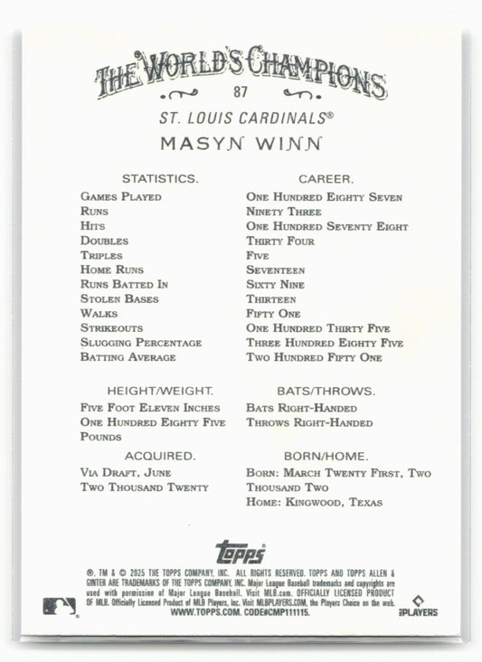 This is a nice example of a 2025 Topps Allen & Ginter #87 Masyn Winn Other important information about this card:In 2025 Masyn Winn played for the St. Louis Cardinals.Please...