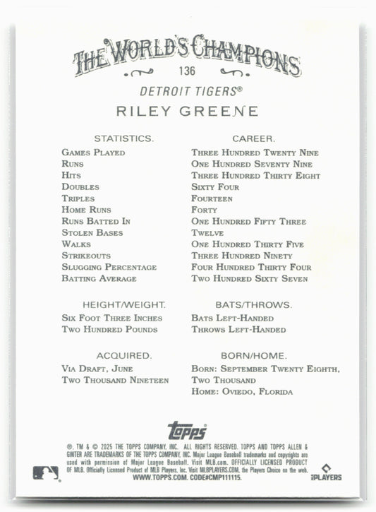 This is a nice example of a 2025 Topps Allen & Ginter #136 Riley Greene Other important information about this card:In 2025 Riley Greene played for the Detroit Tigers.Please check...
