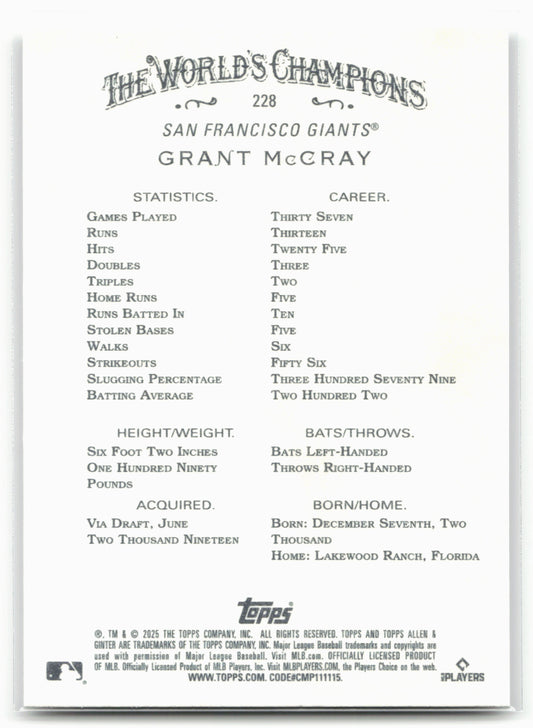 This is a nice example of a 2025 Topps Allen & Ginter #228 Grant McCray Other important information about this card:RCIn 2025 Grant McCray played for the San Francisco Giants.Please...