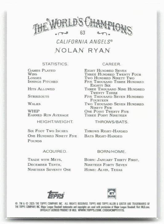 This is a nice example of a 2025 Topps Allen & Ginter #63 Nolan Ryan Other important information about this card:In 2025 Nolan Ryan played for the California Angels.Please check...