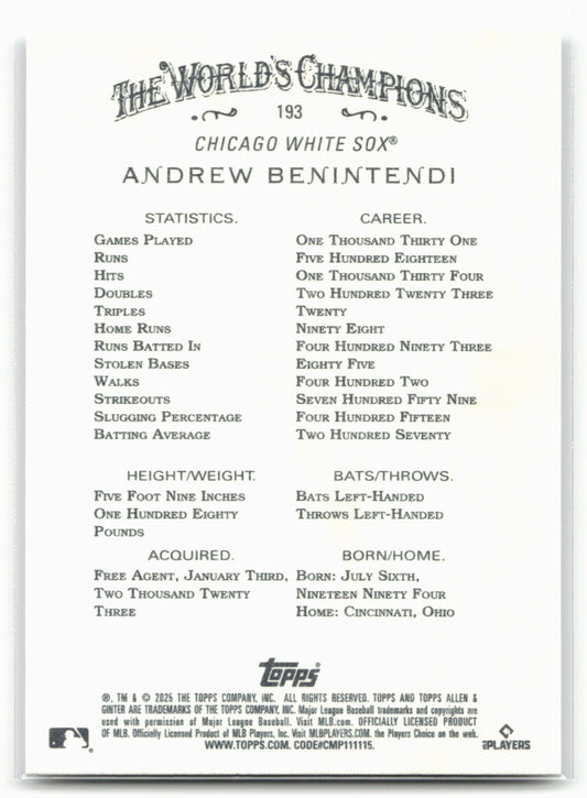 This is a nice example of a 2025 Topps Allen & Ginter #193 Andrew Benintendi Other important information about this card:In 2025 Andrew Benintendi played for the Chicago White Sox.Please...