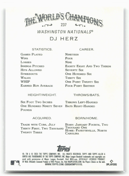This is a nice example of a 2025 Topps Allen & Ginter #237 DJ Herz Other important information about this card:RCIn 2025 DJ Herz played for the Washington Nationals.Please check...