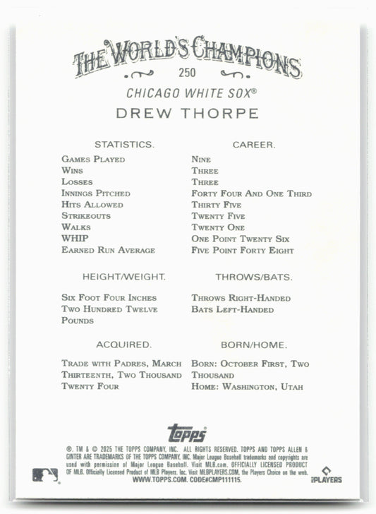 This is a nice example of a 2025 Topps Allen & Ginter #250 Drew Thorpe Other important information about this card:RCIn 2025 Drew Thorpe played for the Chicago White Sox.Please...