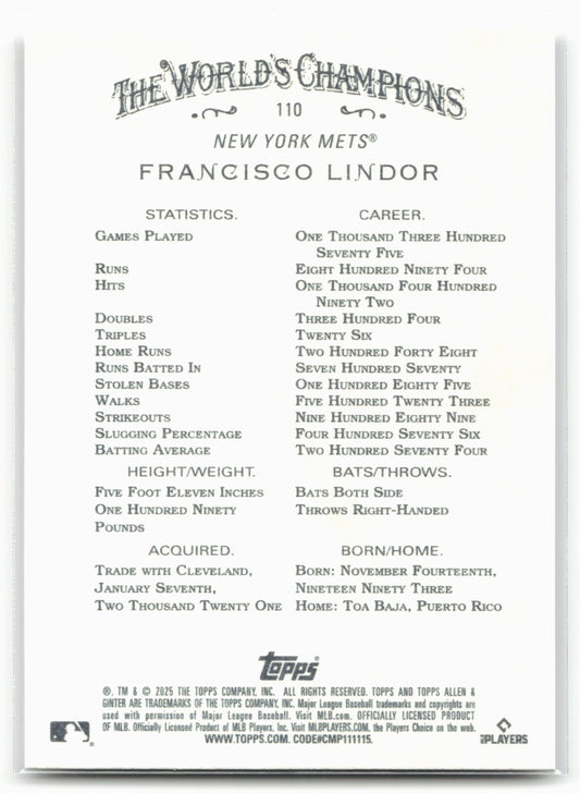 This is a nice example of a 2025 Topps Allen & Ginter #110 Francisco Lindor Other important information about this card:In 2025 Francisco Lindor played for the New York Mets.Please...