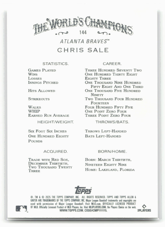 This is a nice example of a 2025 Topps Allen & Ginter #144 Chris Sale Other important information about this card:In 2025 Chris Sale played for the Atlanta Braves.Please check...