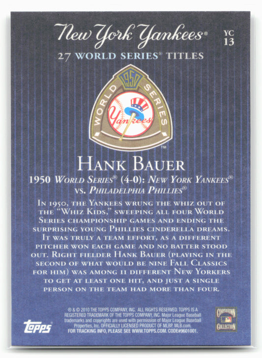 This is a nice example of a 2010 Topps New York Yankees 27 World Series Championships #YC13 Hank Bauer Other important information about this card:1952 Topps;In 2010 Hank Bauer played...