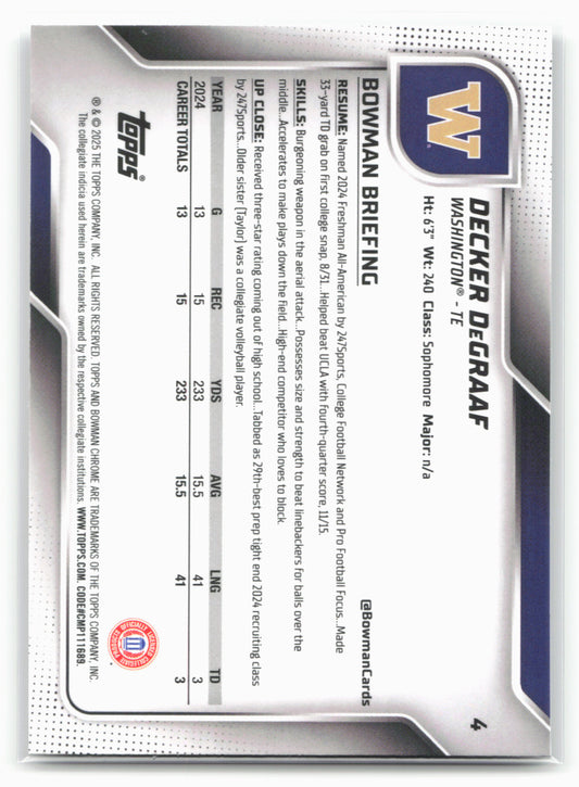 This is a nice example of a 2025 Bowman University Chrome #4 Decker DeGraaf Other important information about this card:In 2025 Decker DeGraaf played for the Washington Huskies.Please check out...
