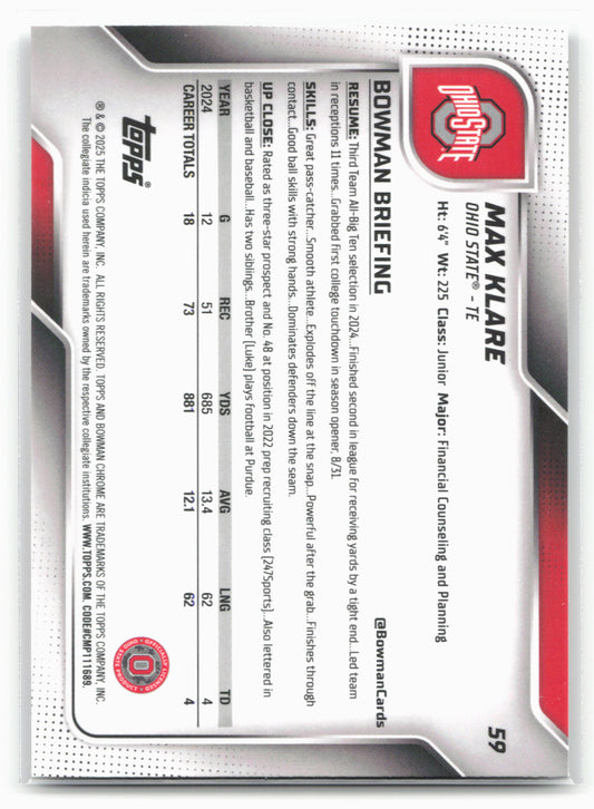 This is a nice example of a 2025 Bowman University Chrome #59 Max Klare Other important information about this card:In 2025 Max Klare played for the Ohio State Buckeyes.Please check...