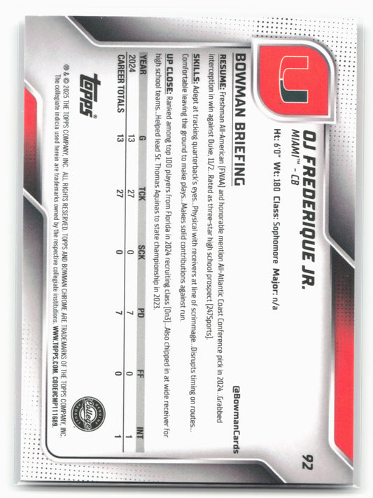 This is a nice example of a 2025 Bowman University Chrome #92 OJ Frederique Jr. Other important information about this card:In 2025 OJ Frederique Jr. played for the Miami Hurricanes.Please...