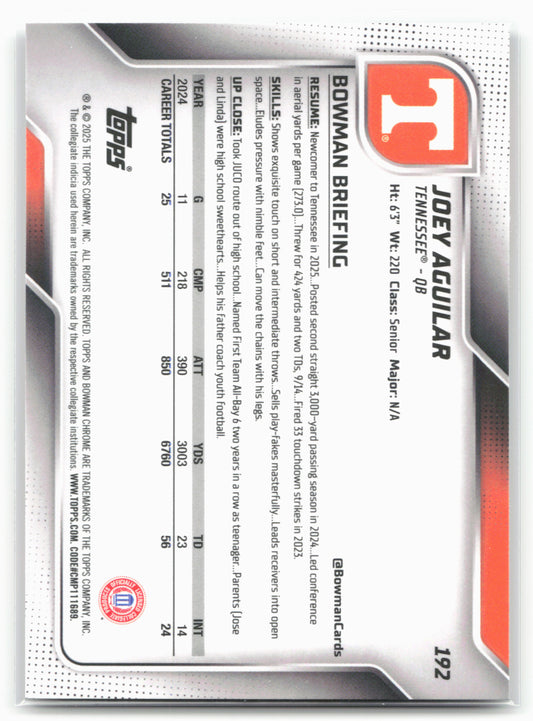This is a nice example of a 2025 Bowman University Chrome #192 Joey Aguilar Other important information about this card:In 2025 Joey Aguilar played for the Tennessee Volunteers.Please check out...
