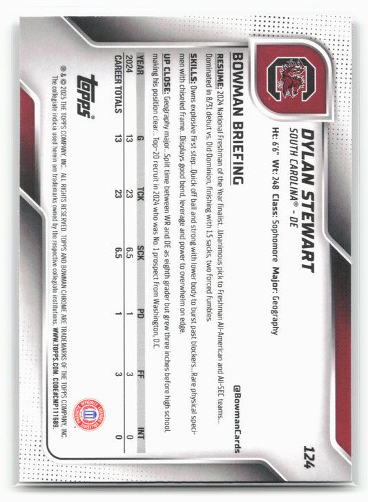 This is a nice example of a 2025 Bowman University Chrome #124 Dylan Stewart Other important information about this card:In 2025 Dylan Stewart played for the South Carolina Gamecocks.Please check...