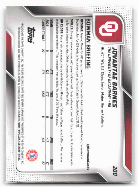 This is a nice example of a 2025 Bowman University Chrome #200 Jovantae Barnes Other important information about this card:In 2025 Jovantae Barnes played for the Oklahoma Sooners.Please check out...