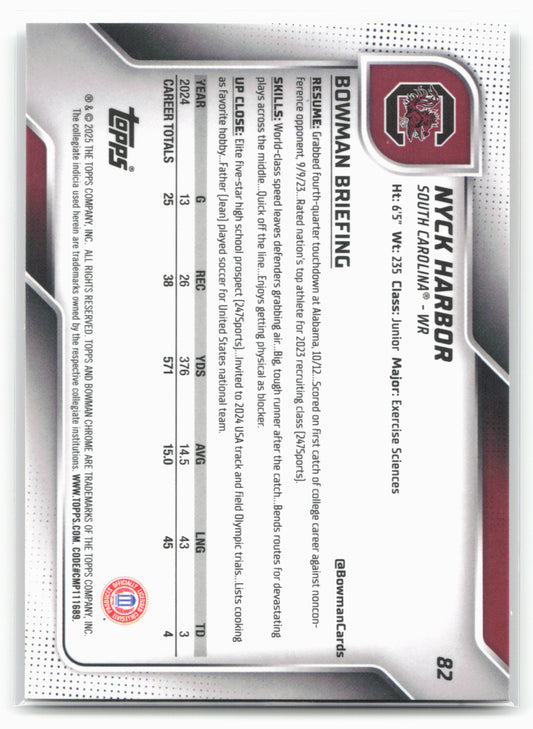 This is a nice example of a 2025 Bowman University Chrome #82 Nyck Harbor Other important information about this card:In 2025 Nyck Harbor played for the South Carolina Gamecocks.Please check...