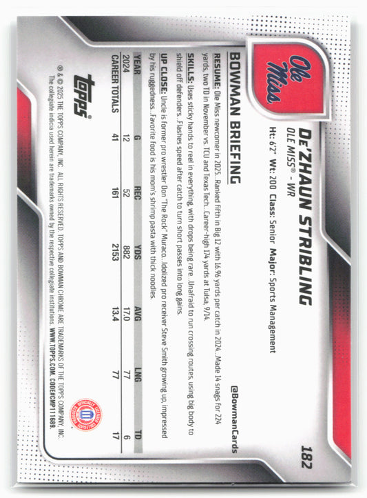 This is a nice example of a 2025 Bowman University Chrome #182 De'Zhaun Stribling Other important information about this card:In 2025 De'Zhaun Stribling played for the Ole Miss Rebels.Please check...