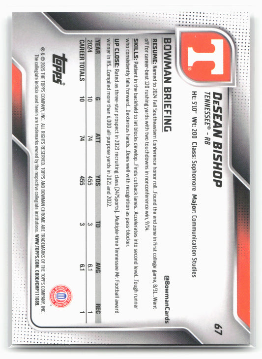 This is a nice example of a 2025 Bowman University Chrome #67 DeSean Bishop Other important information about this card:In 2025 DeSean Bishop played for the Tennessee Volunteers.Please check out...
