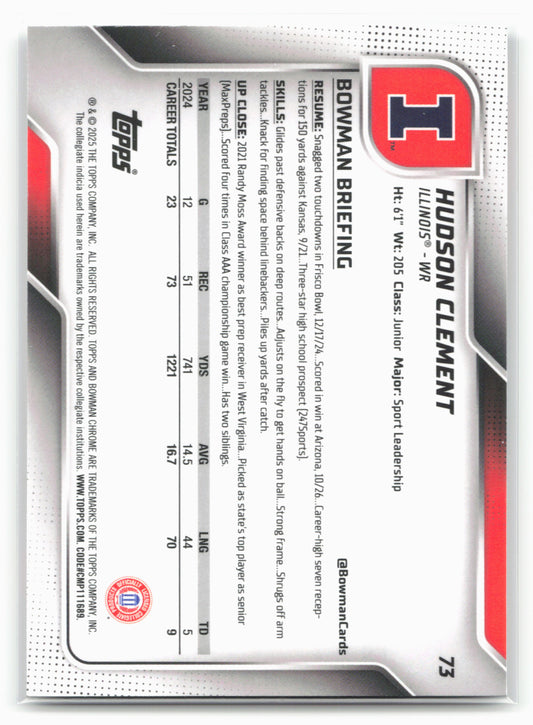This is a nice example of a 2025 Bowman University Chrome #73 Hudson Clement Other important information about this card:In 2025 Hudson Clement played for the Illinois Fighting Illini.Please check...