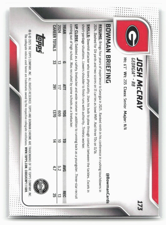 This is a nice example of a 2025 Bowman University Chrome #173 Josh McCray Other important information about this card:In 2025 Josh McCray played for the Georgia Bulldogs.Please check out...