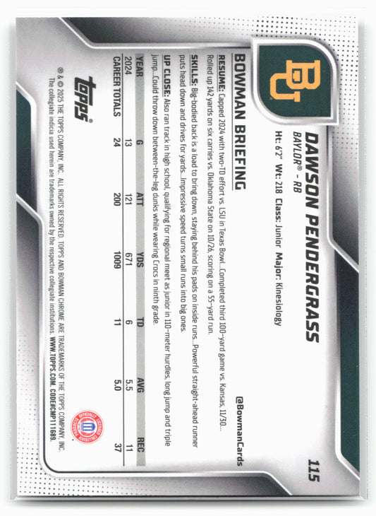 This is a nice example of a 2025 Bowman University Chrome #115 Dawson Pendergrass Other important information about this card:In 2025 Dawson Pendergrass played for the Baylor Bears.Please check out...