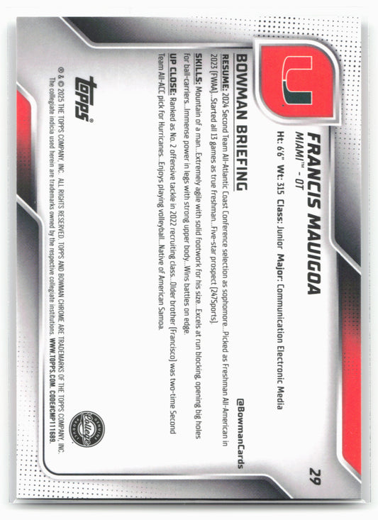 This is a nice example of a 2025 Bowman University Chrome #29 Francis Mauigoa Other important information about this card:In 2025 Francis Mauigoa played for the Miami Hurricanes.Please check out...