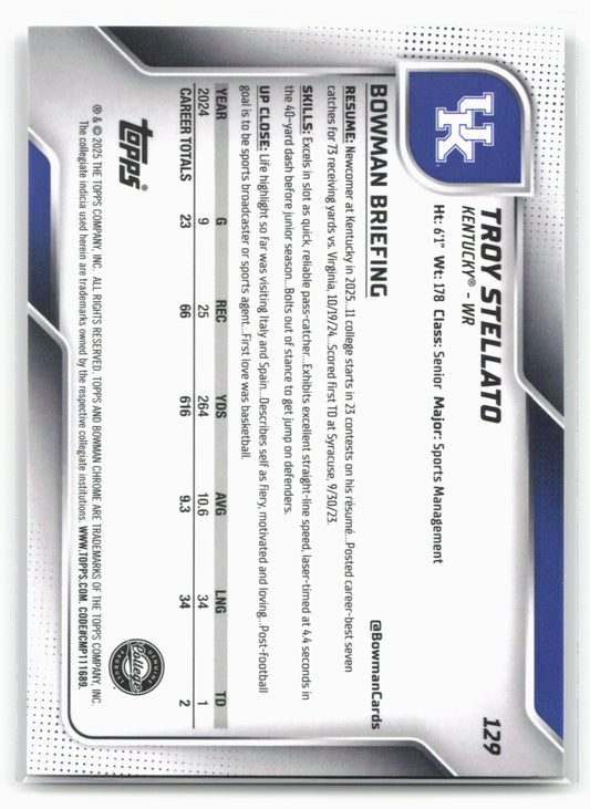 This is a nice example of a 2025 Bowman University Chrome #129 Troy Stellato Other important information about this card:In 2025 Troy Stellato played for the Kentucky Wildcats.Please check out...