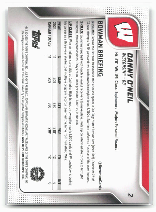 This is a nice example of a 2025 Bowman University Chrome #2 Danny O'Neil Other important information about this card:In 2025 Danny O'Neil played for the Wisconsin Badgers.Please check out...